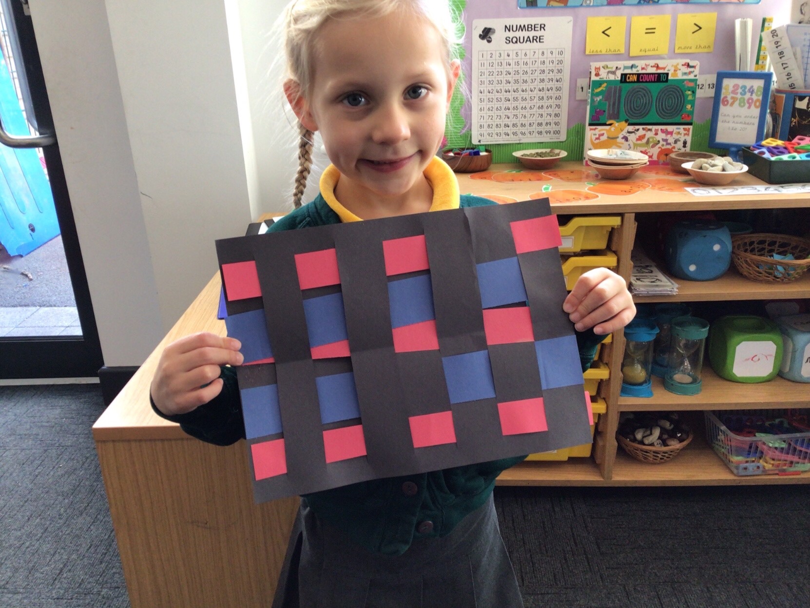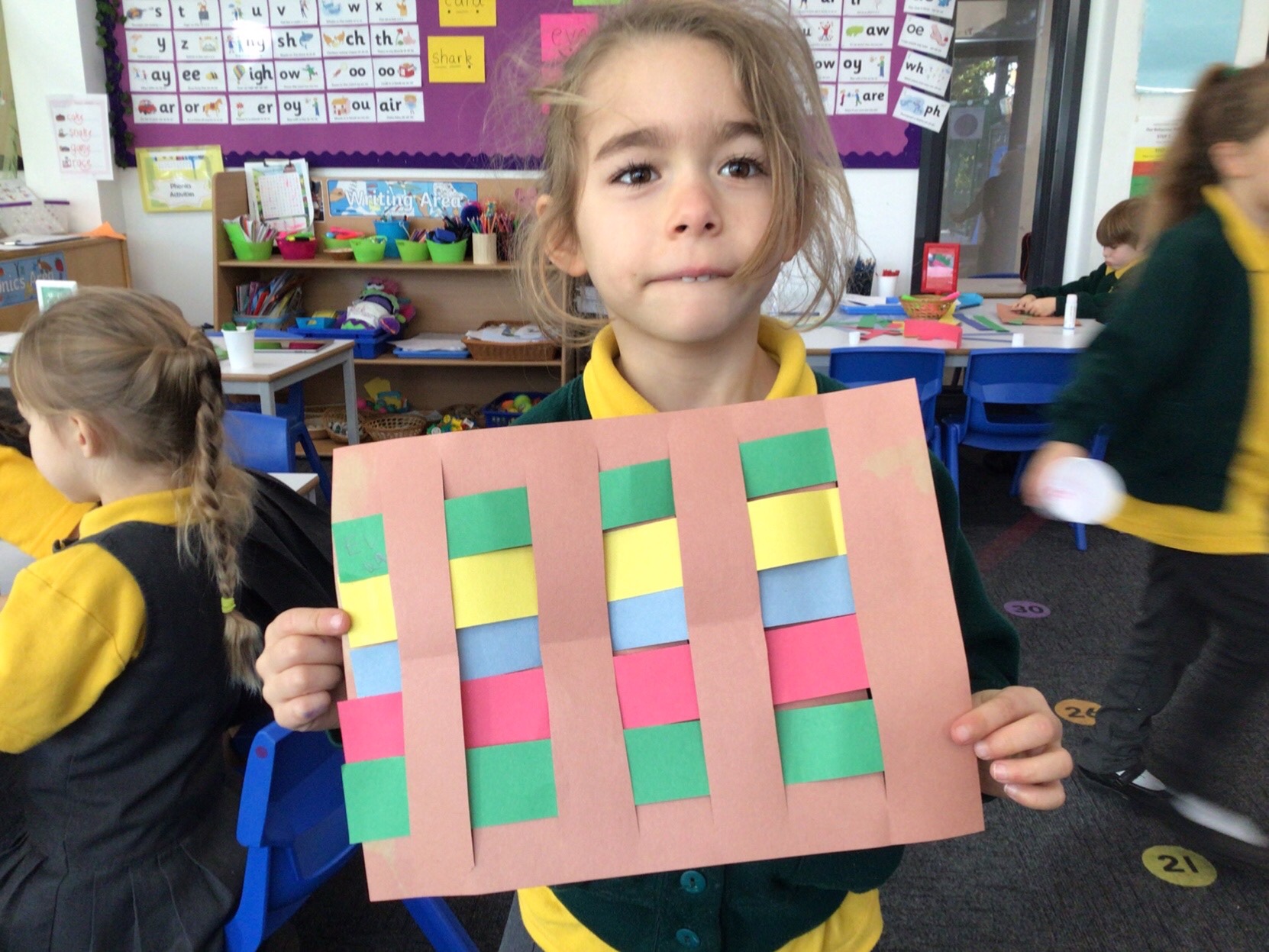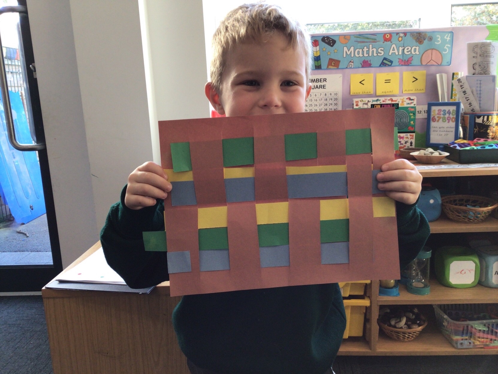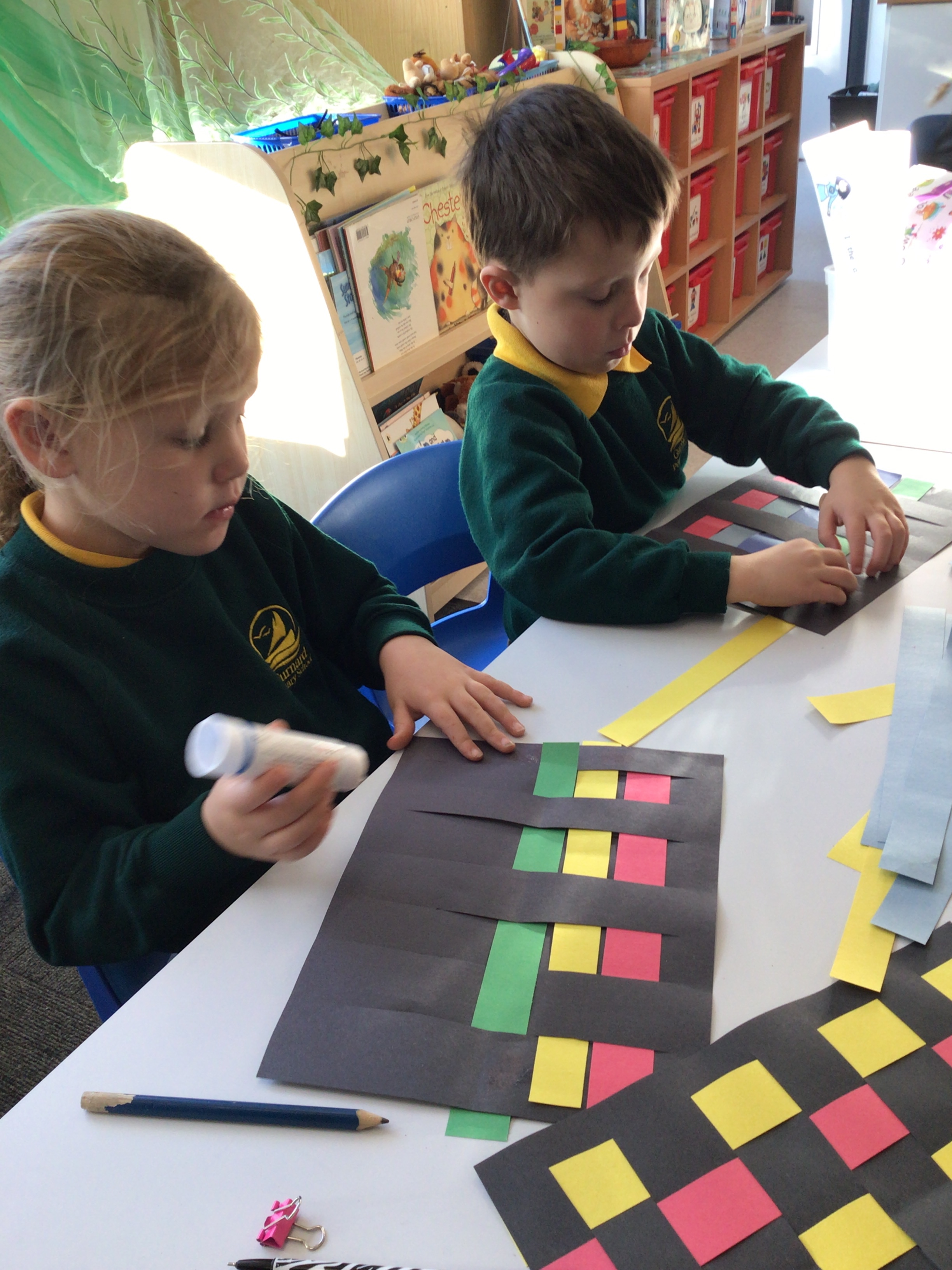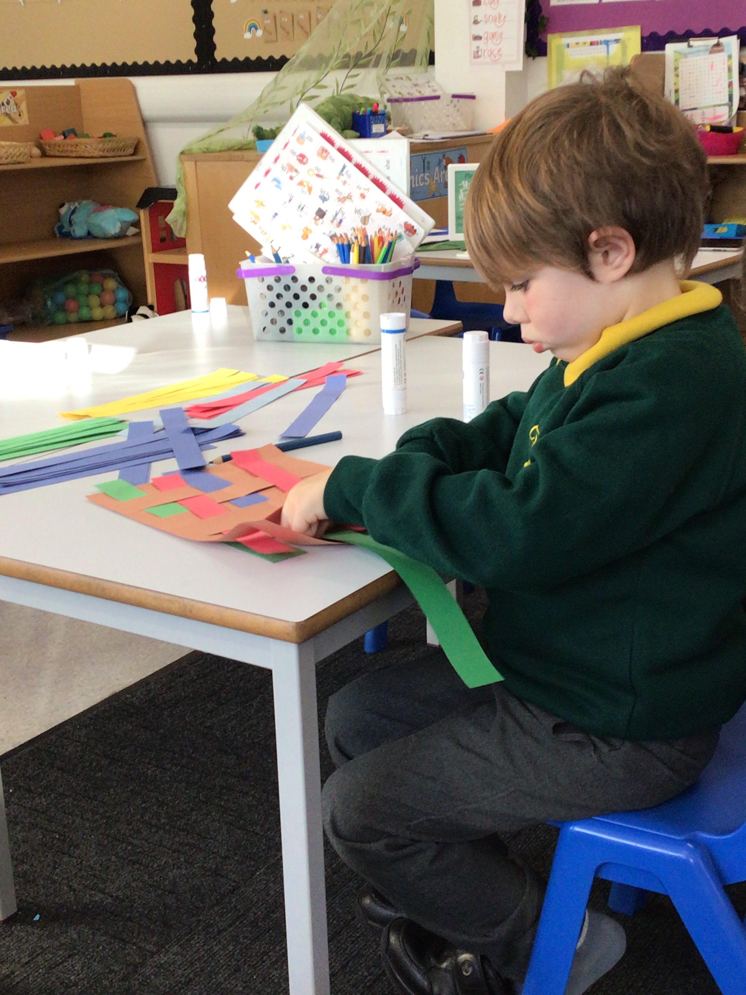 Today we tried weaving with paper. All children could attach the paper by threading over and and under. We tried really hard to alternate how each row started as well.