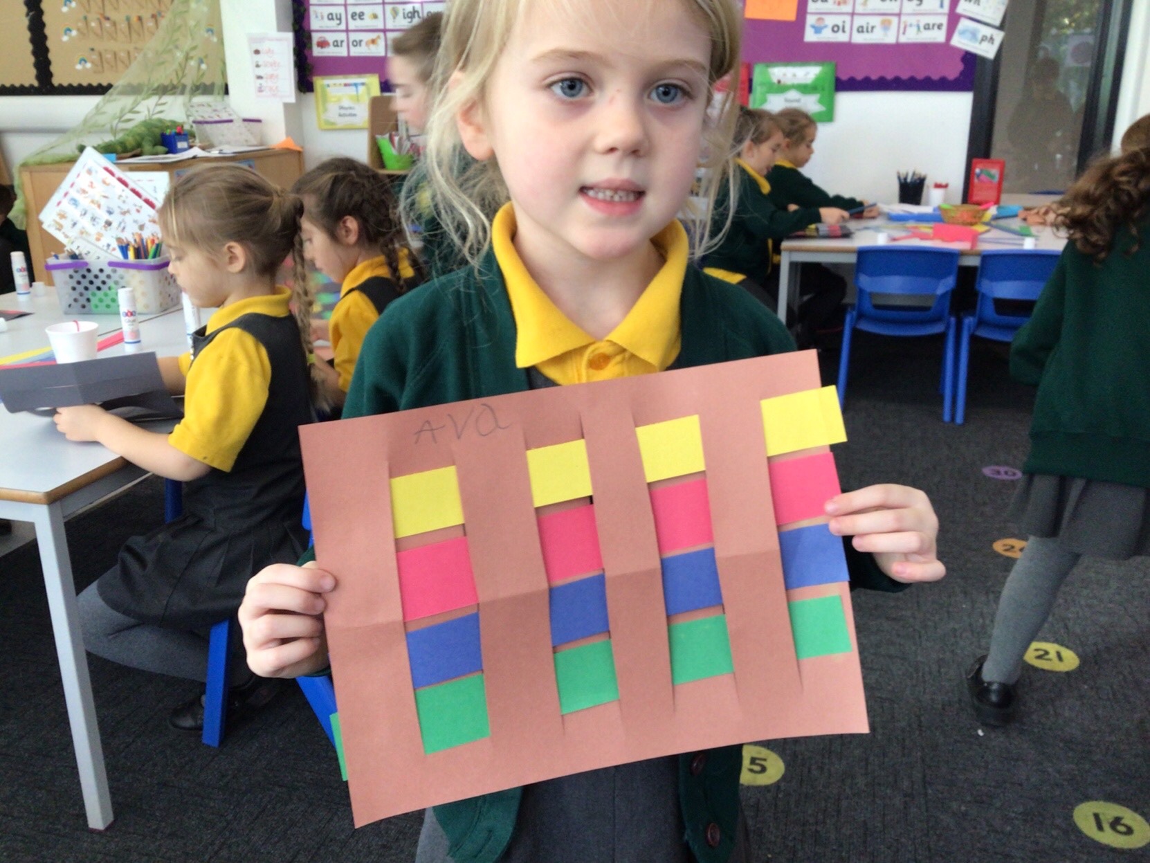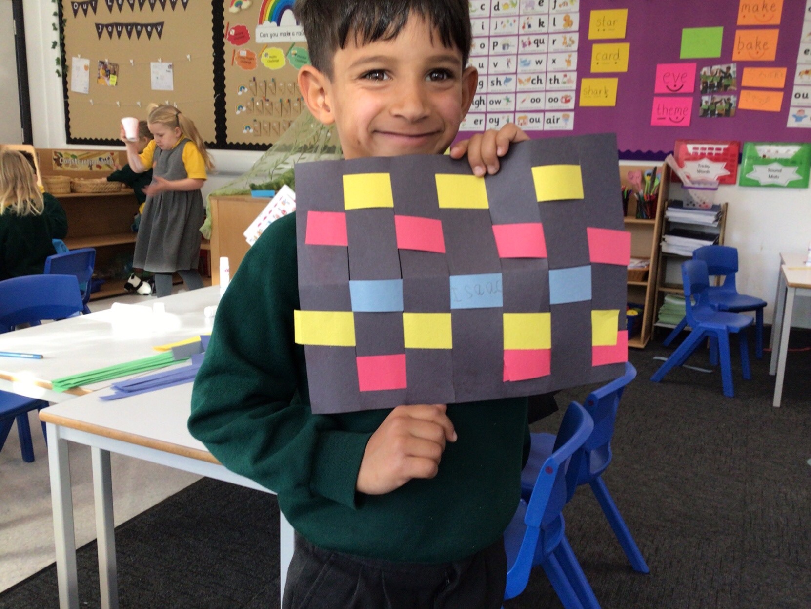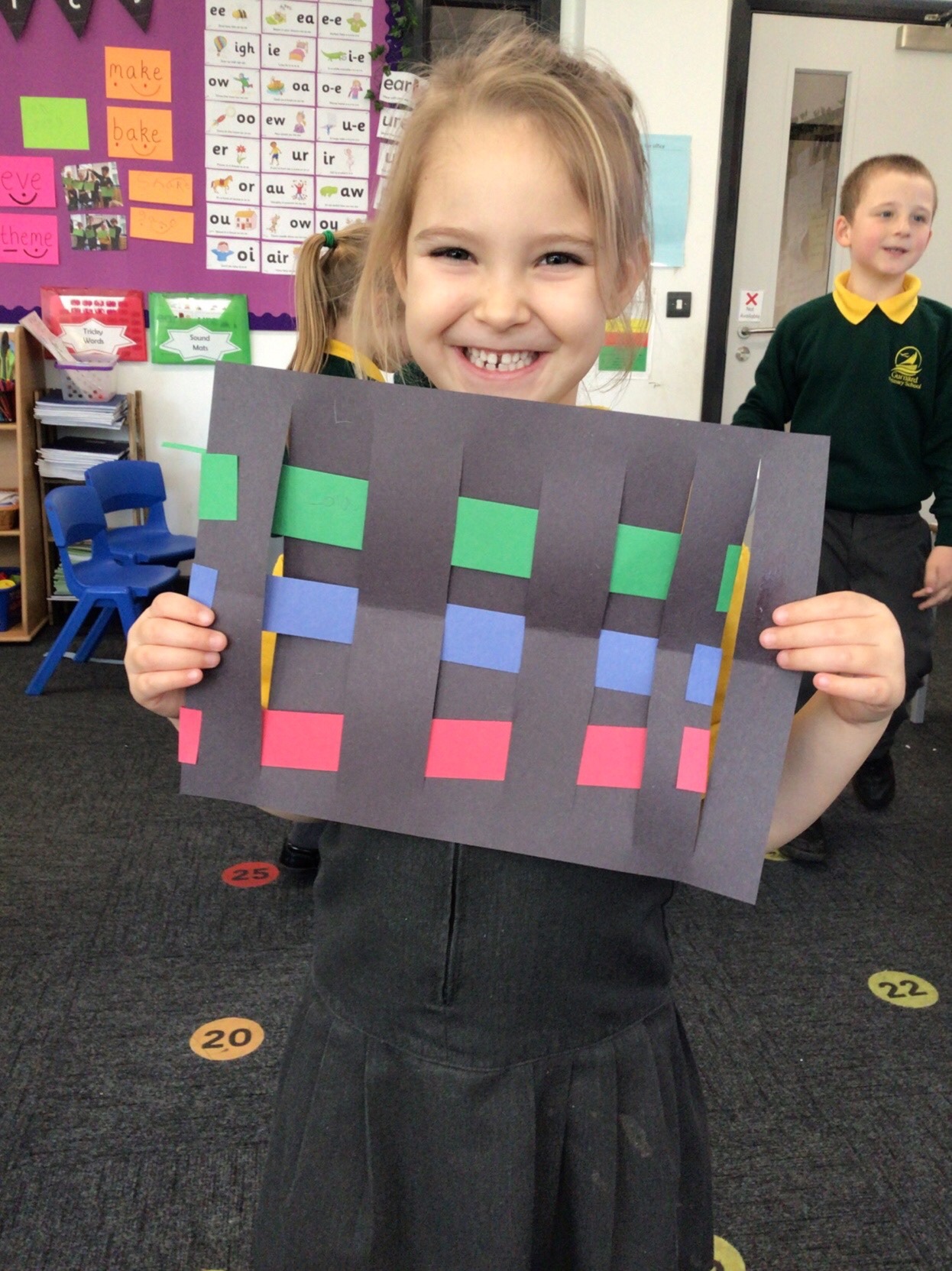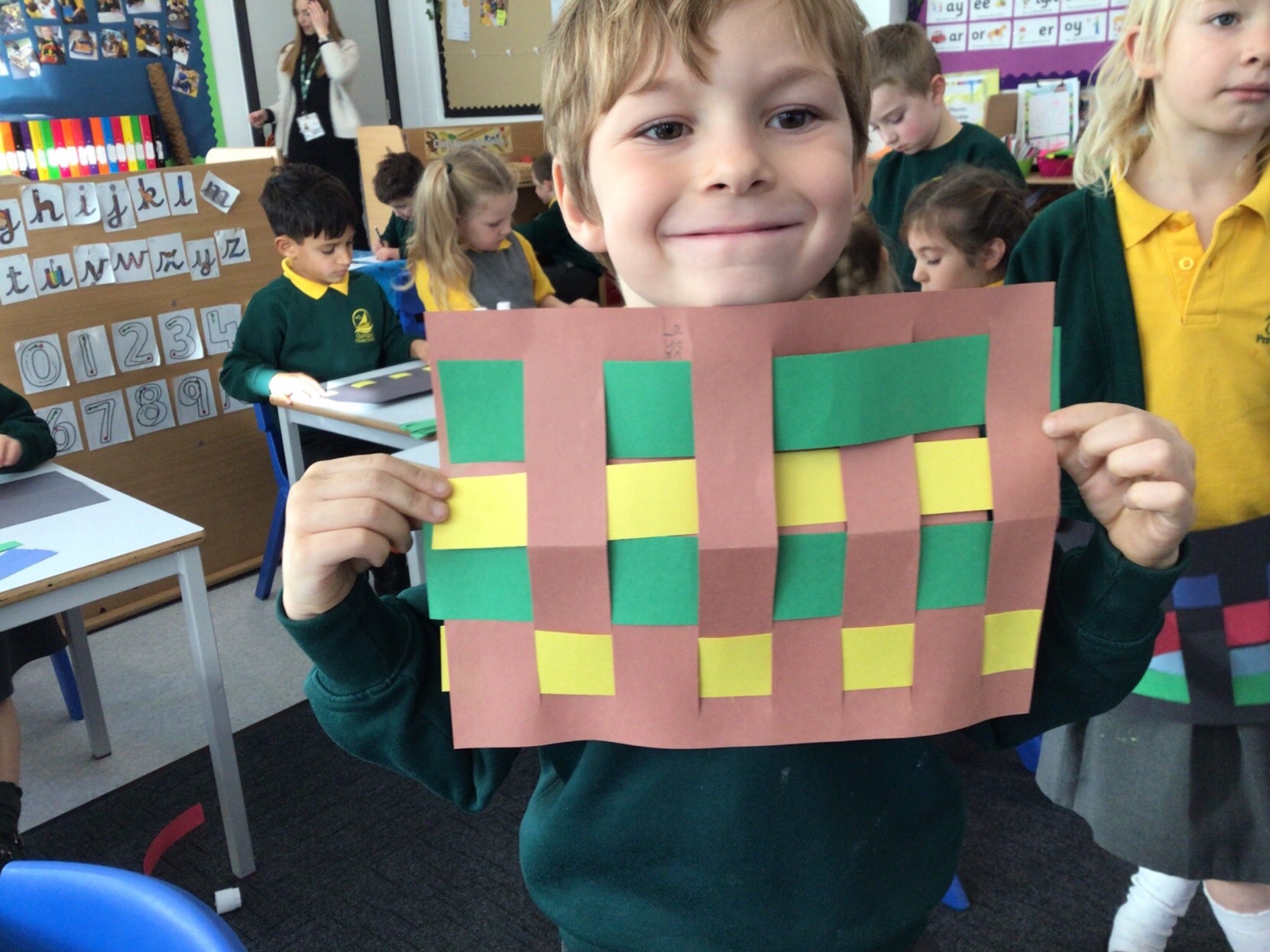 Today we tried weaving with paper. All children could attach the paper by threading over and and under. We tried really hard to alternate how each row started as well.