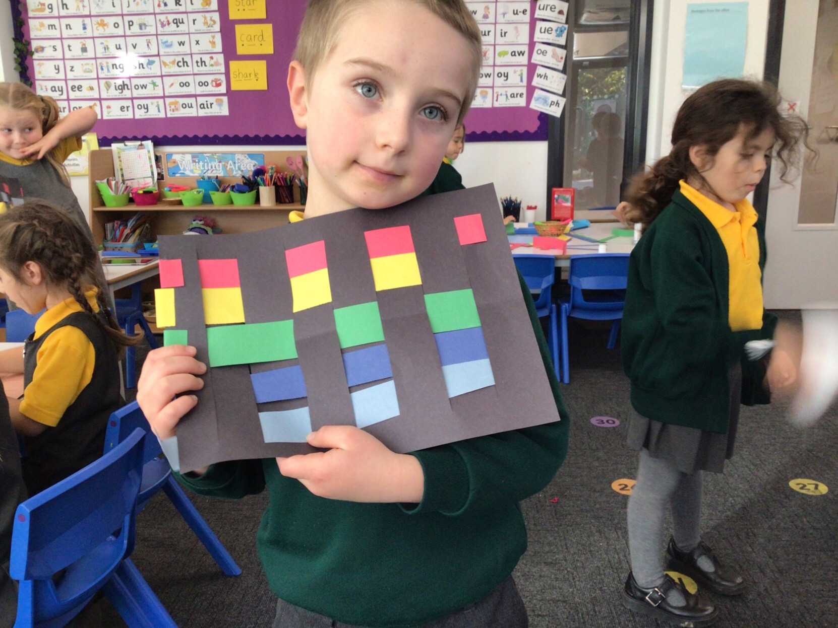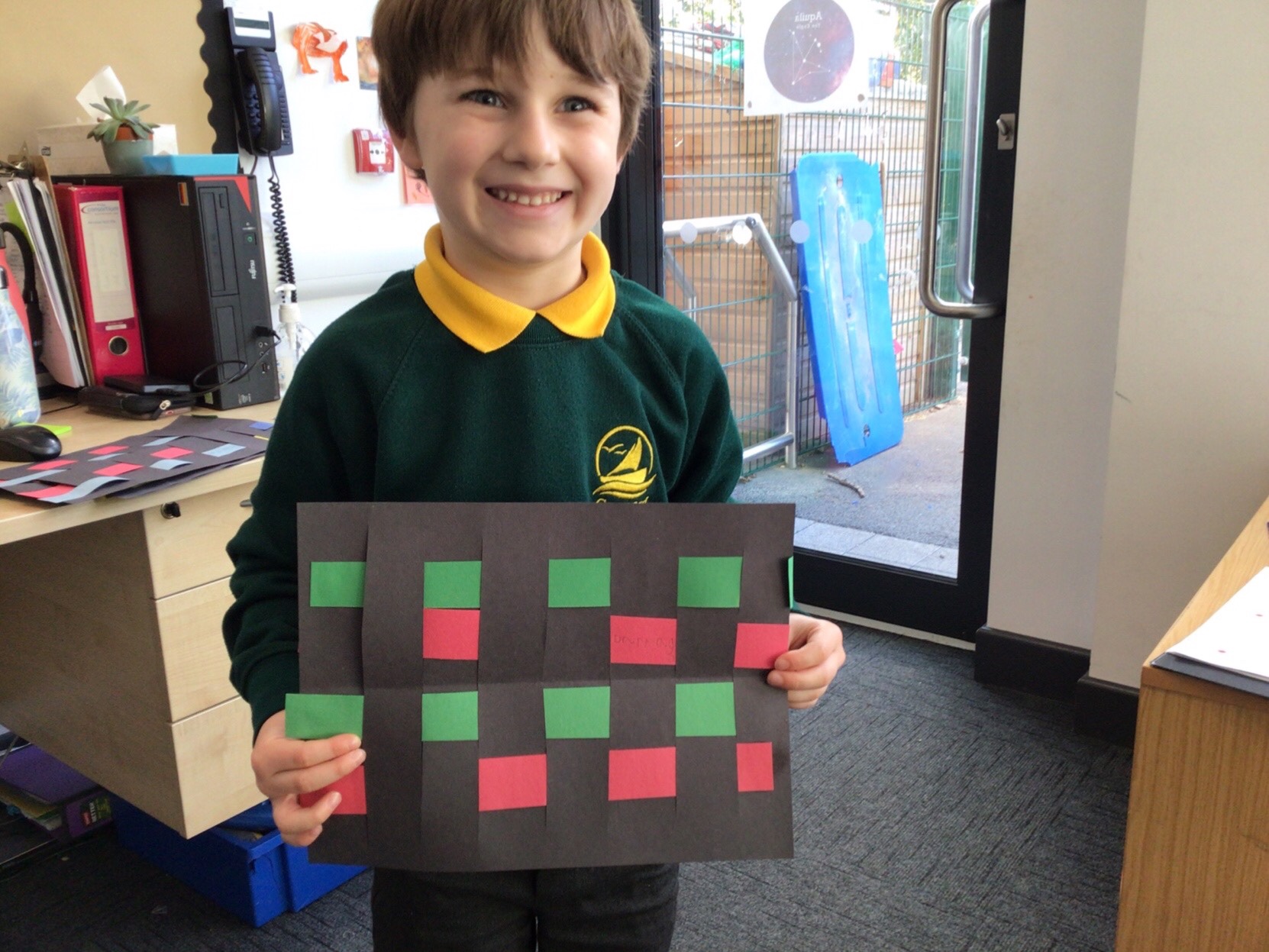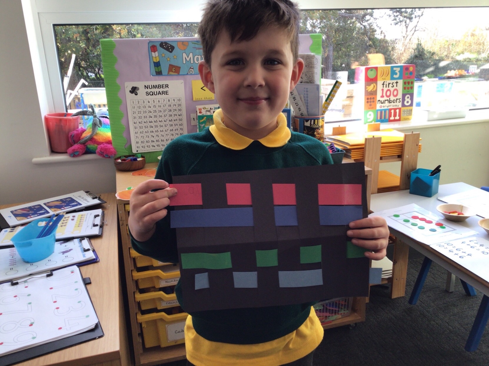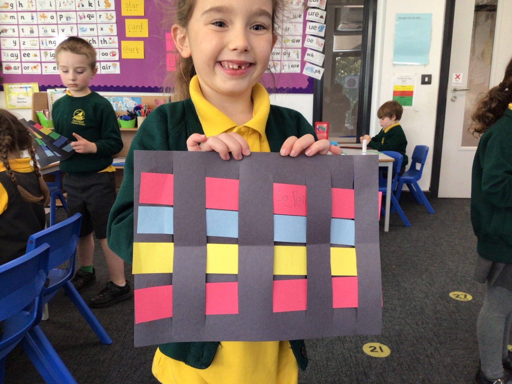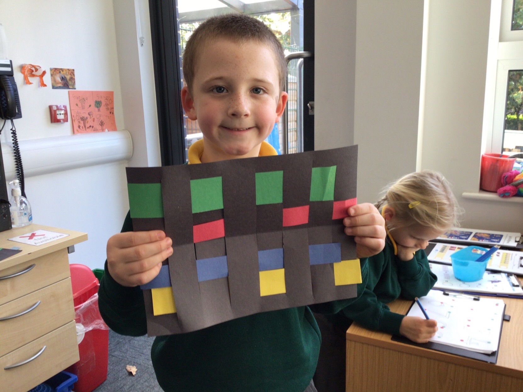 Today we tried weaving with paper. All children could attach the paper by threading over and and under. We tried really hard to alternate how each row started as well.
