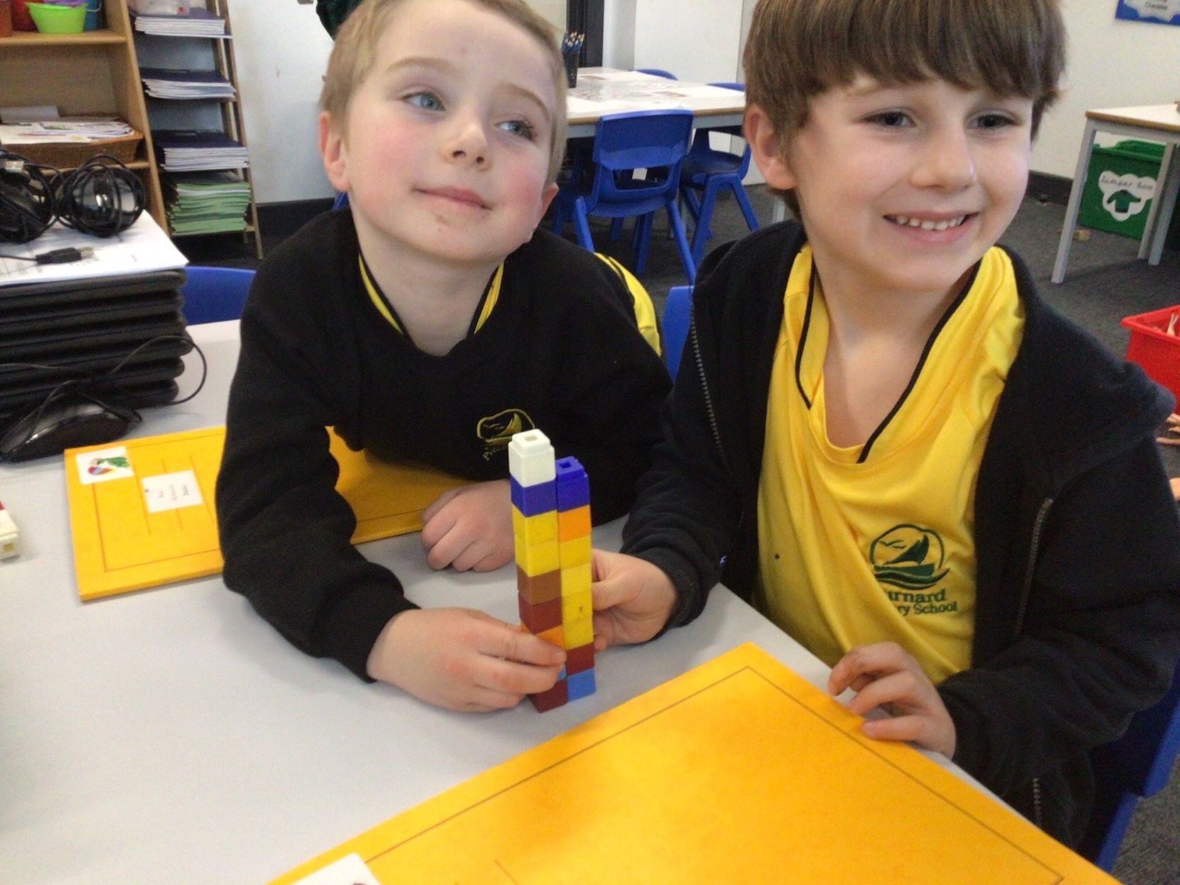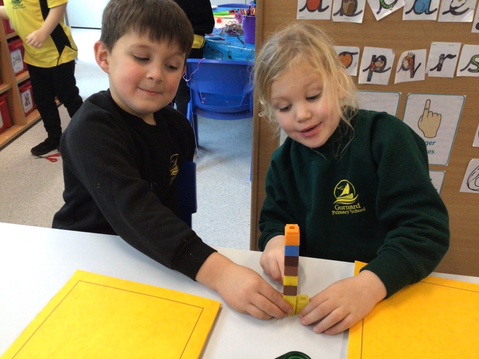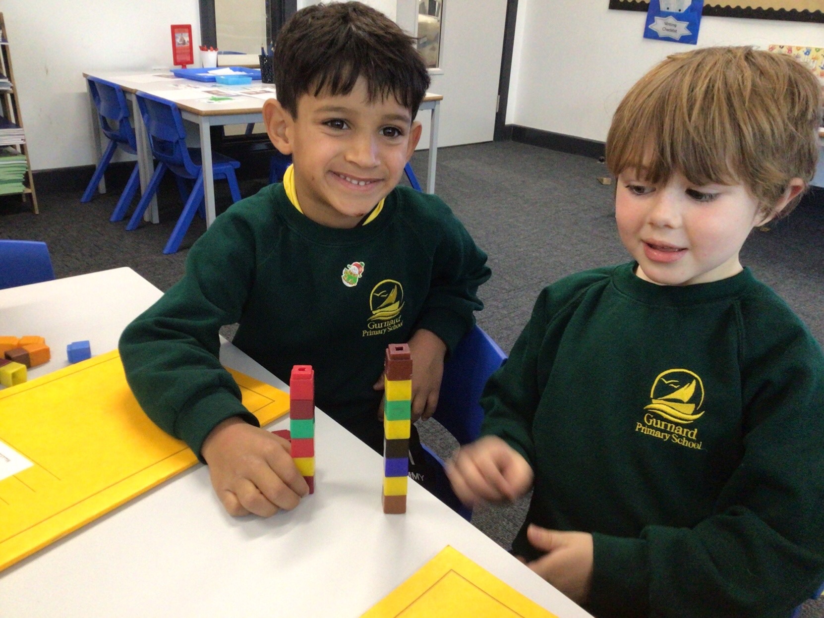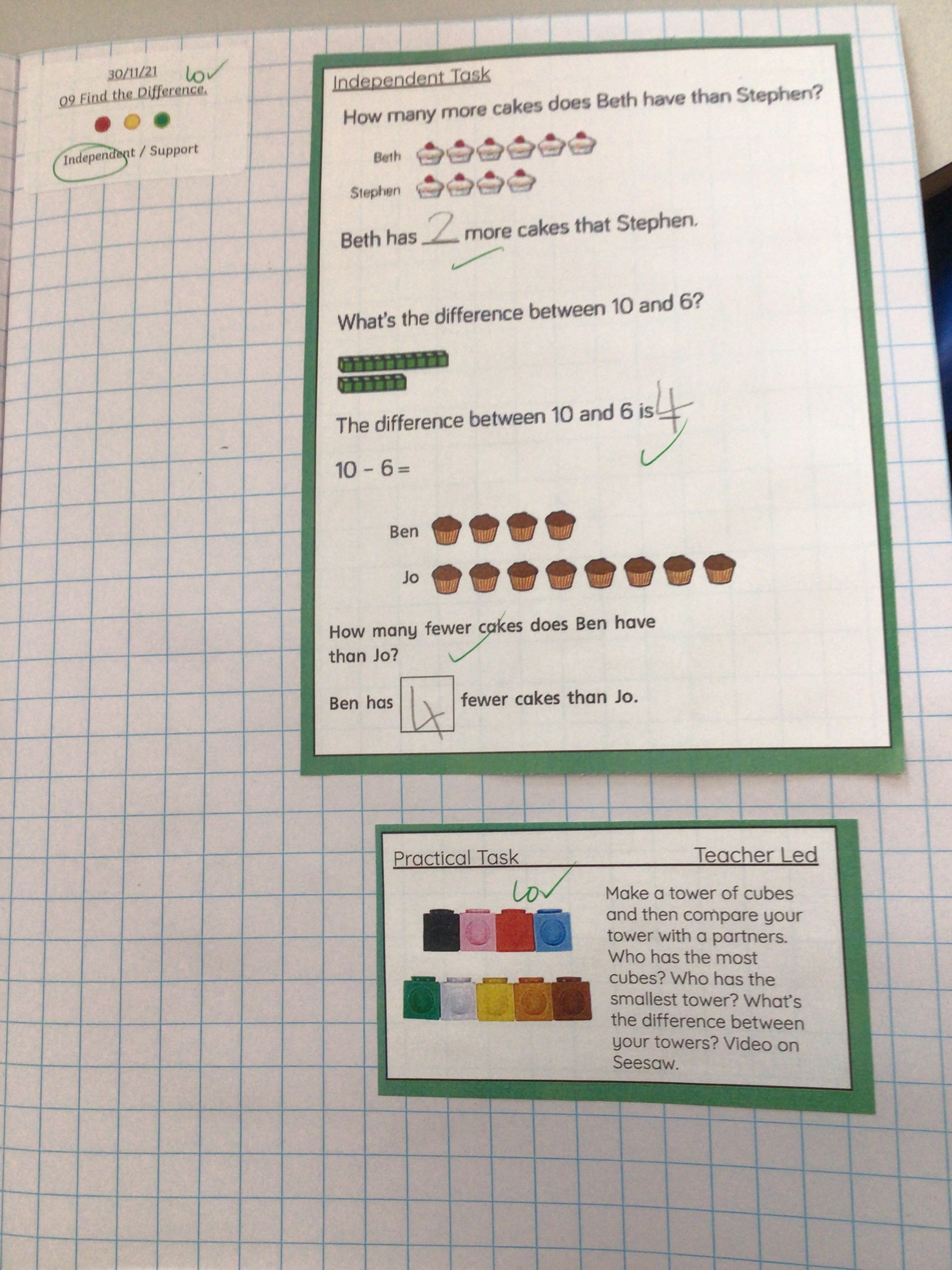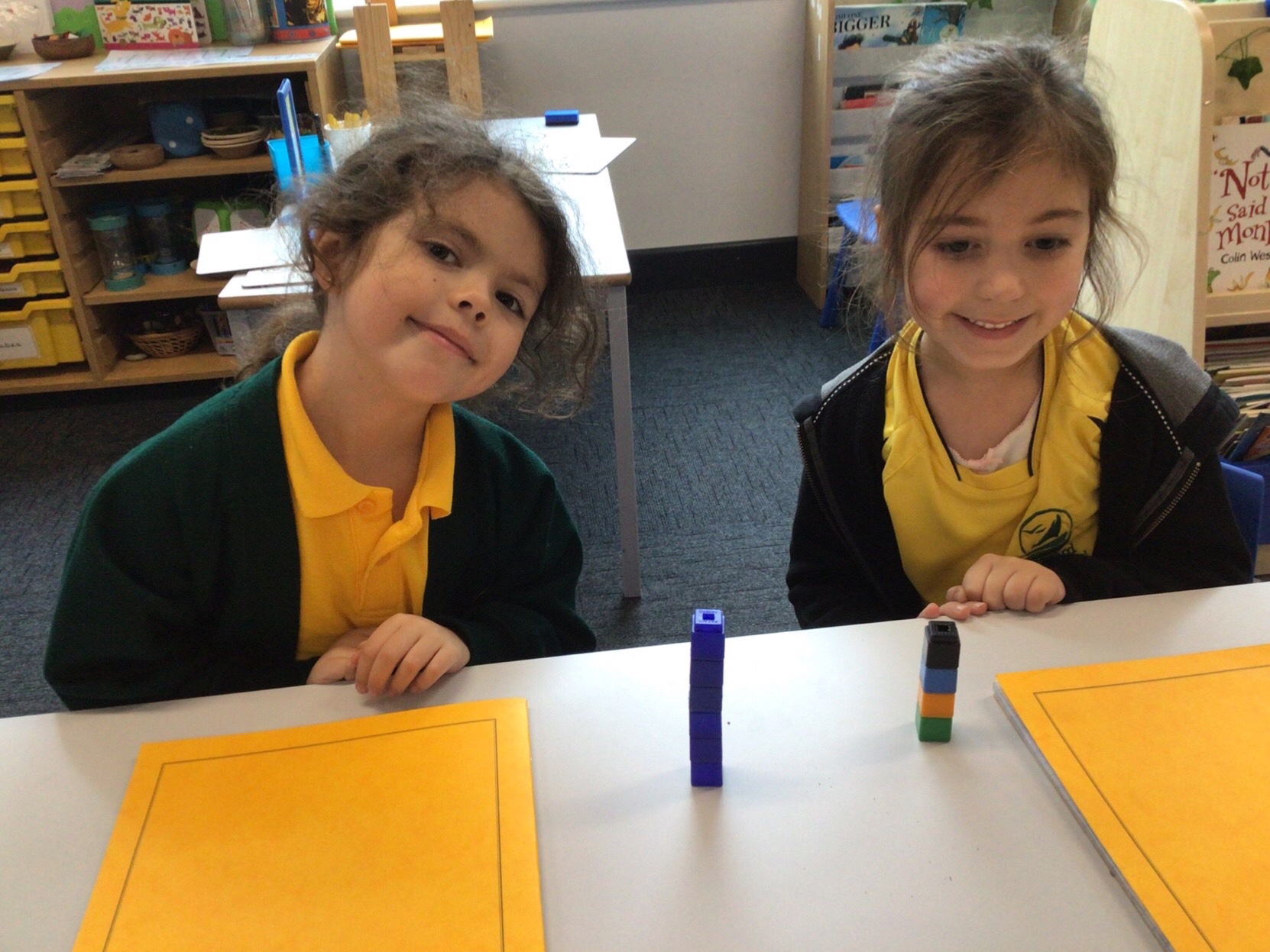 Today we have been finding the difference. We worked with a partner to make towers of cubes and then had to find out who had more. We then worked out the difference between the two towers.