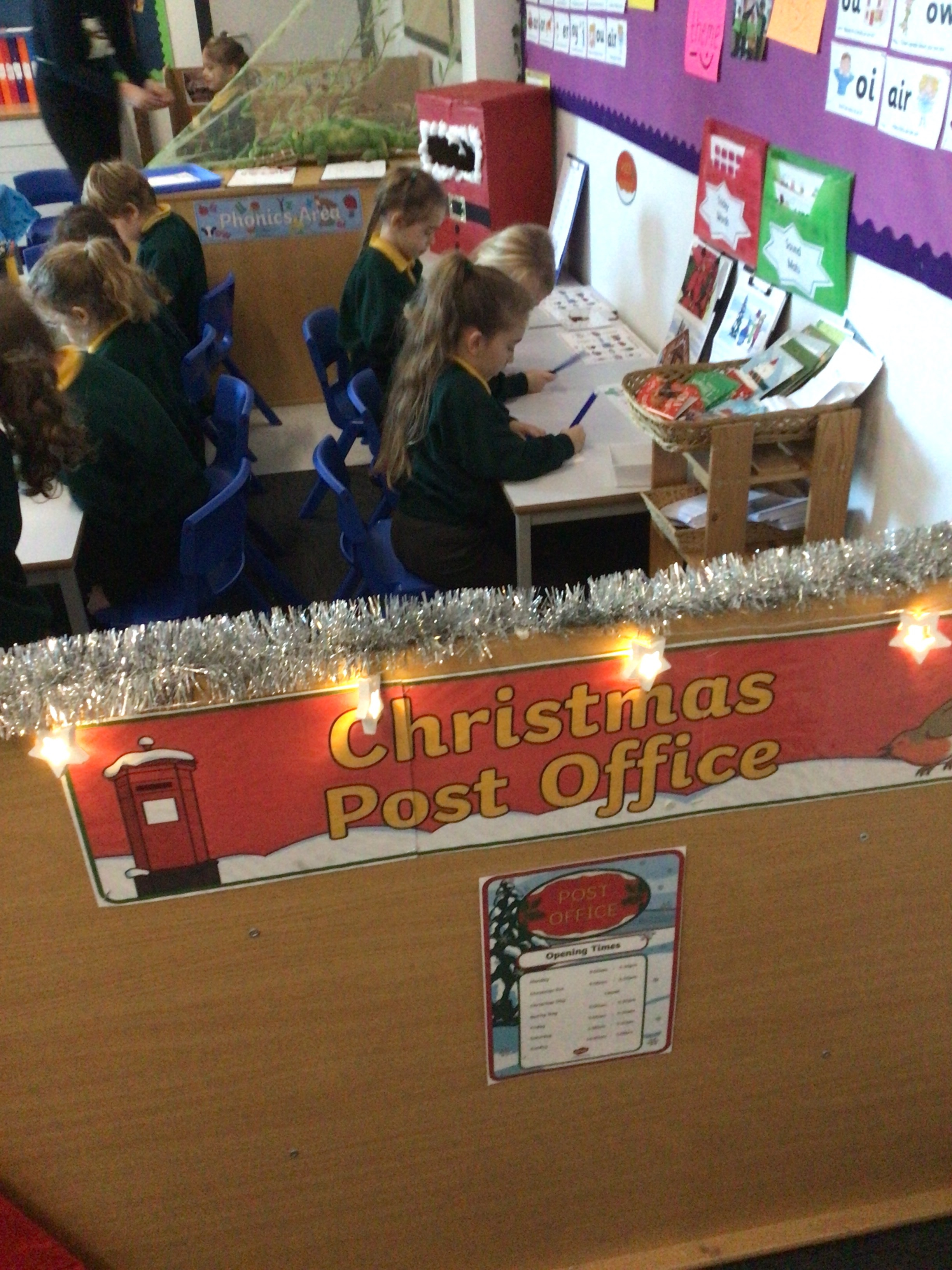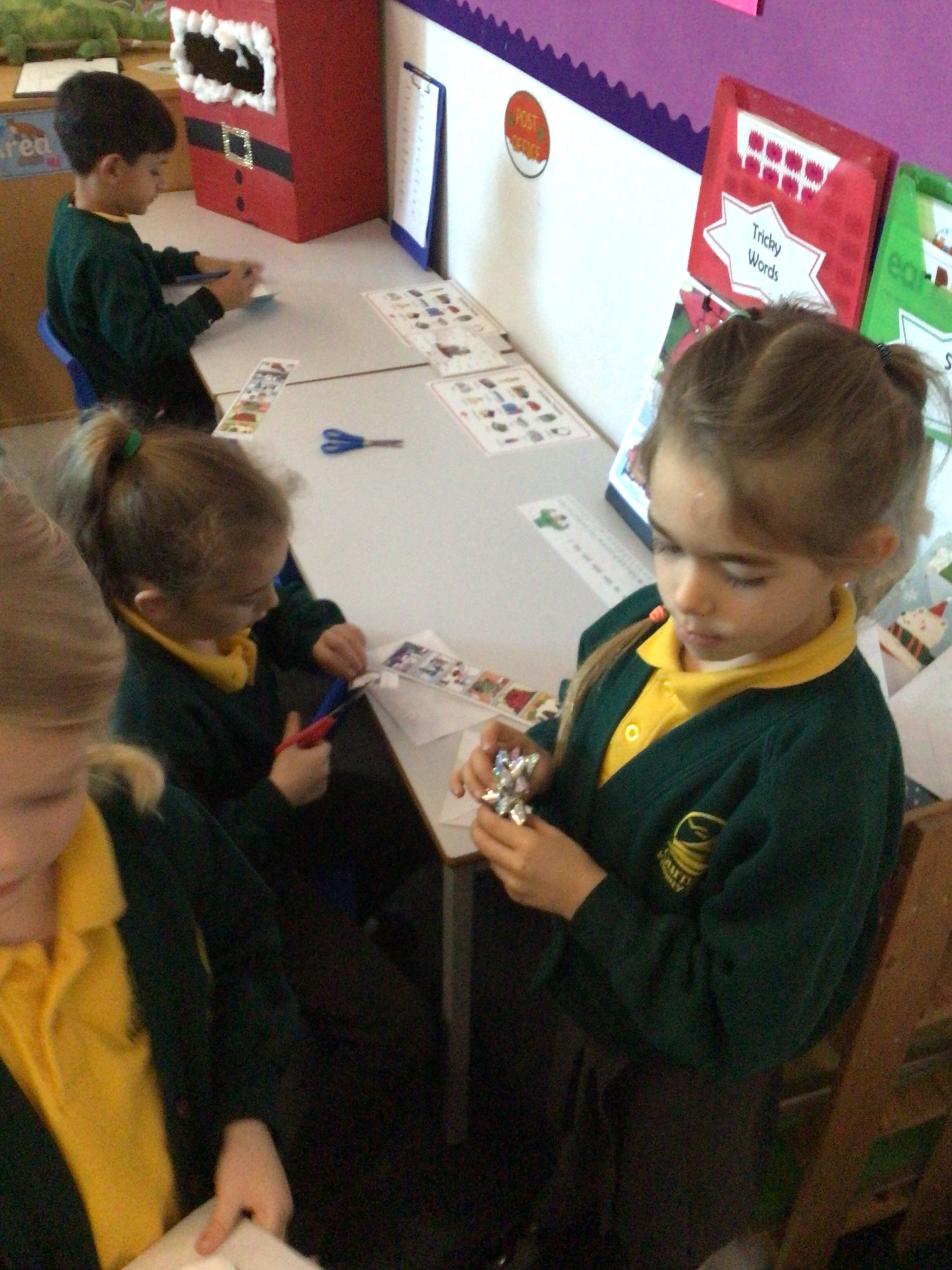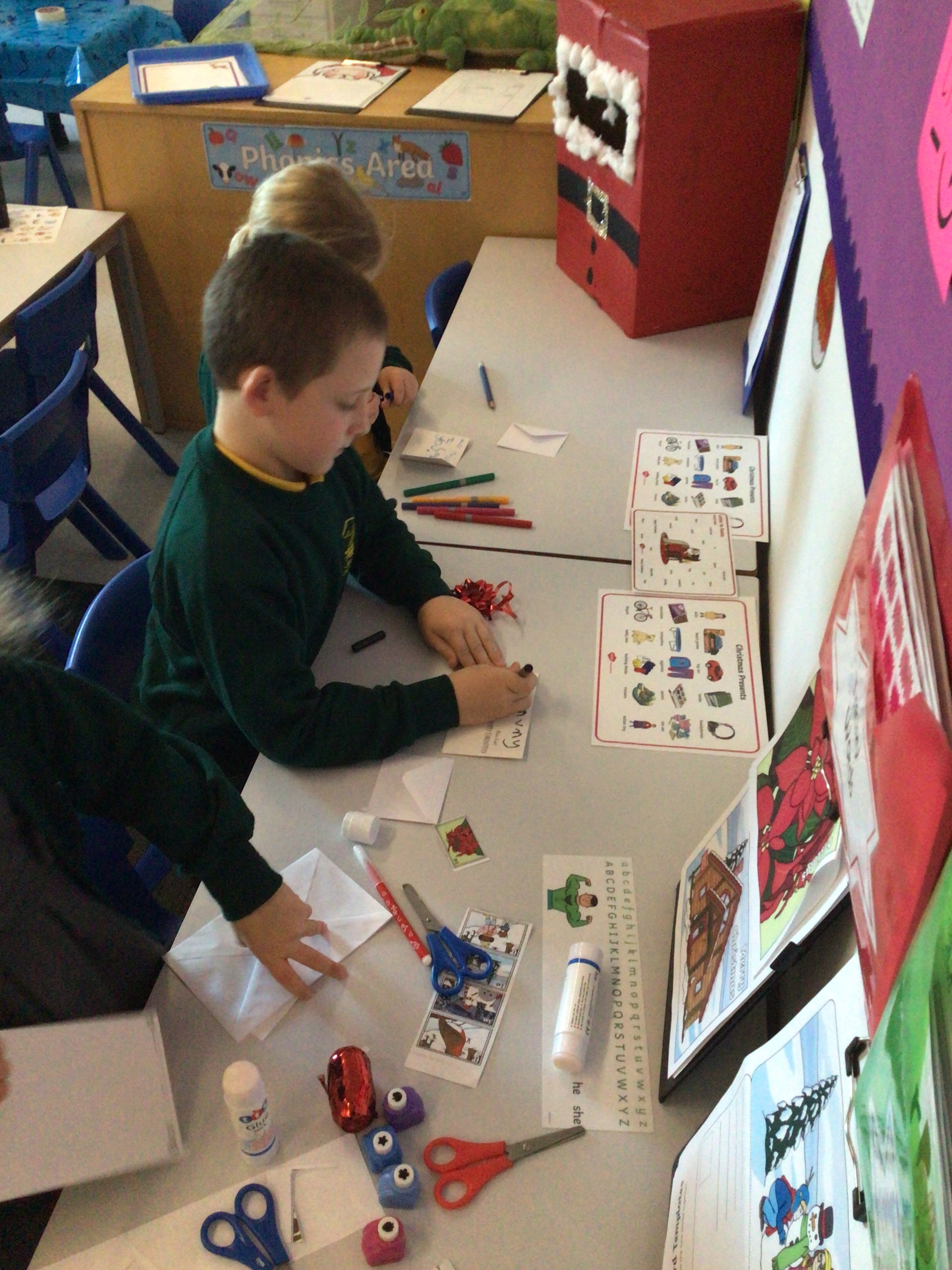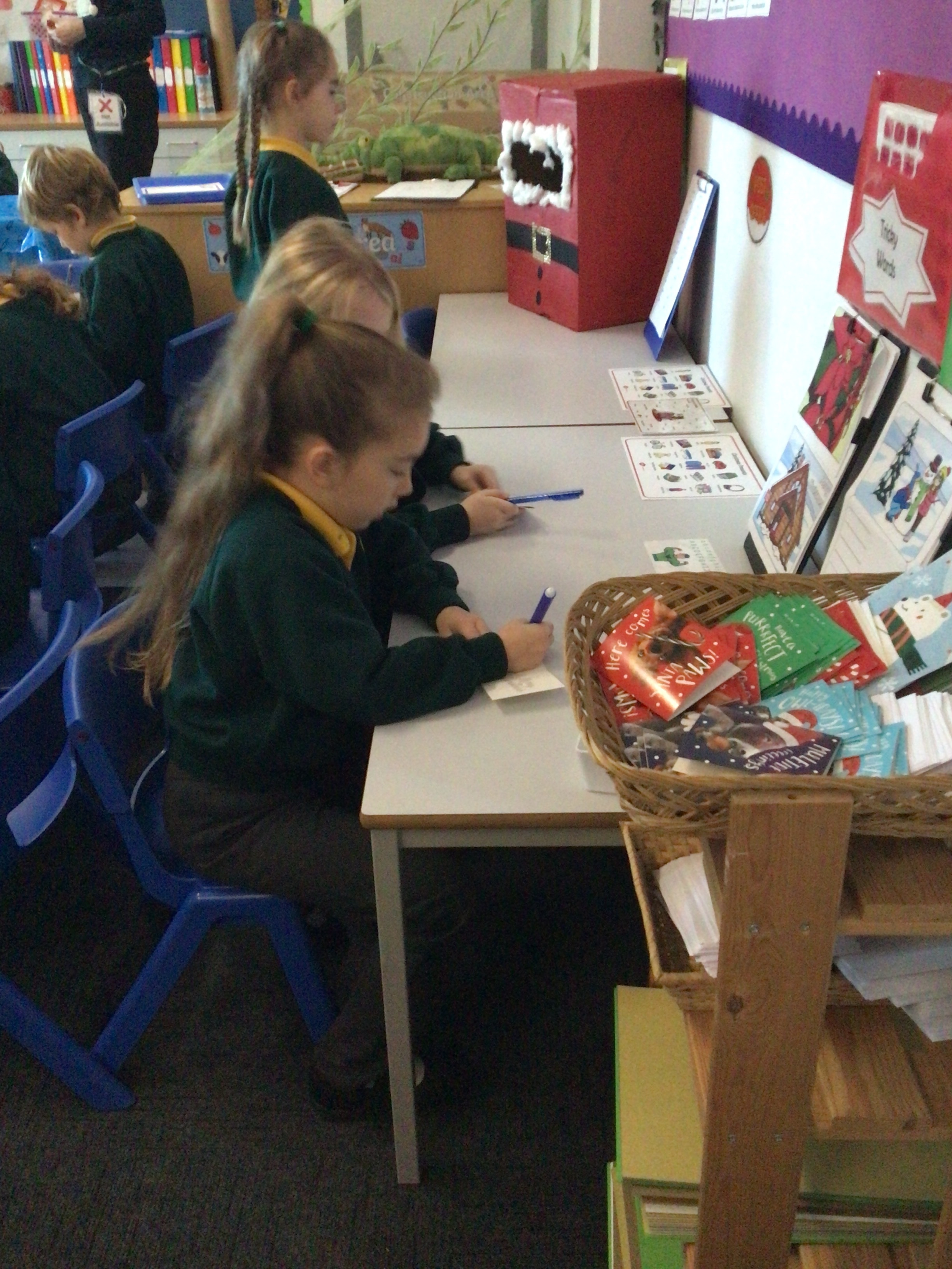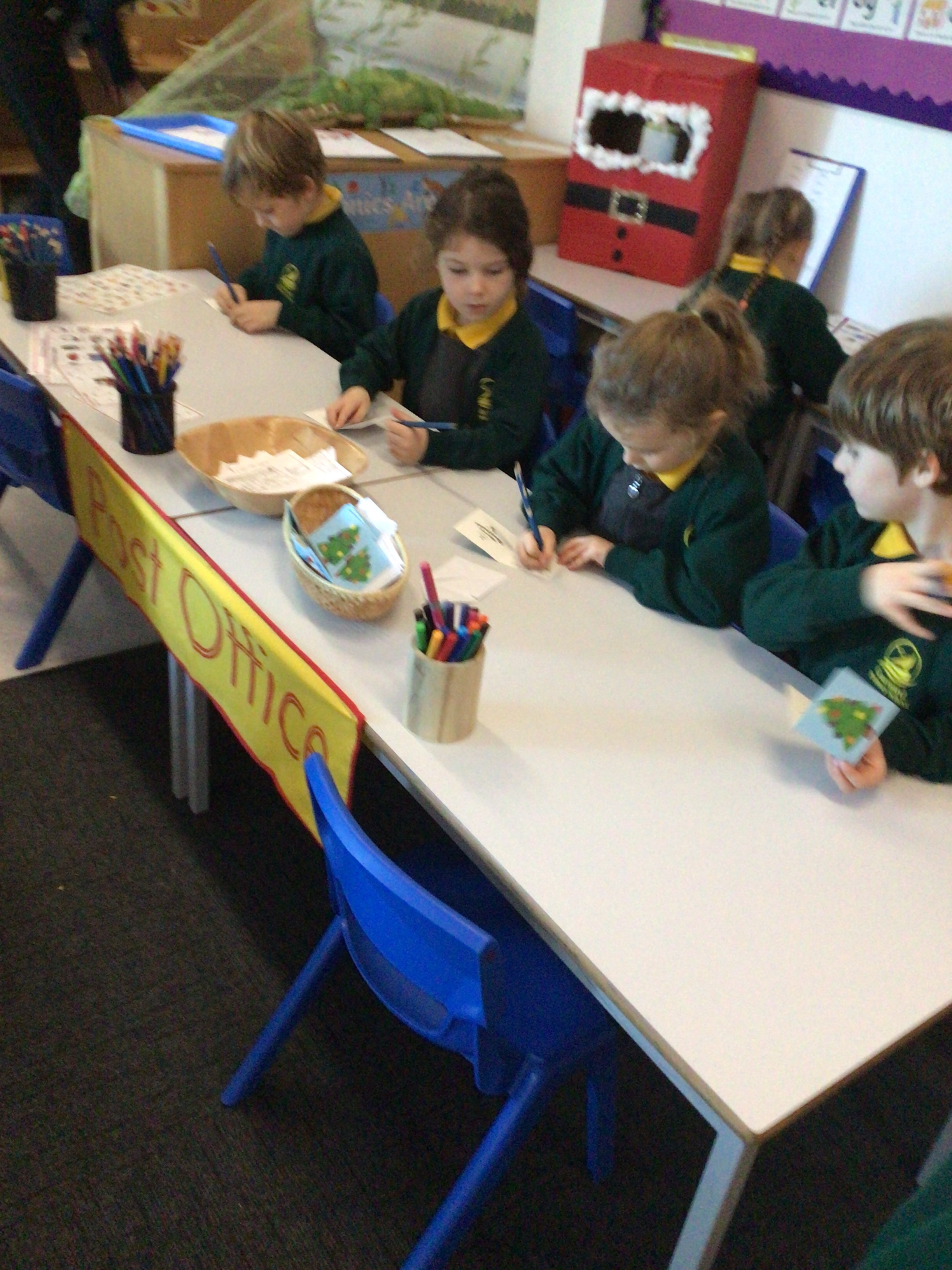 We were very excited this morning to discover that the classroom has been turned into a Winter Wonderland! All the children’s paper chains have been hung, the Christmas tree put up and fairy lights everywhere! The writing area has been turned into a Christmas post office with a Father Christmas post box. It has been such a busy area of the classroom all day! The children have thoroughly enjoyed making cards for each other and for family members and writing letters to Father Christmas!