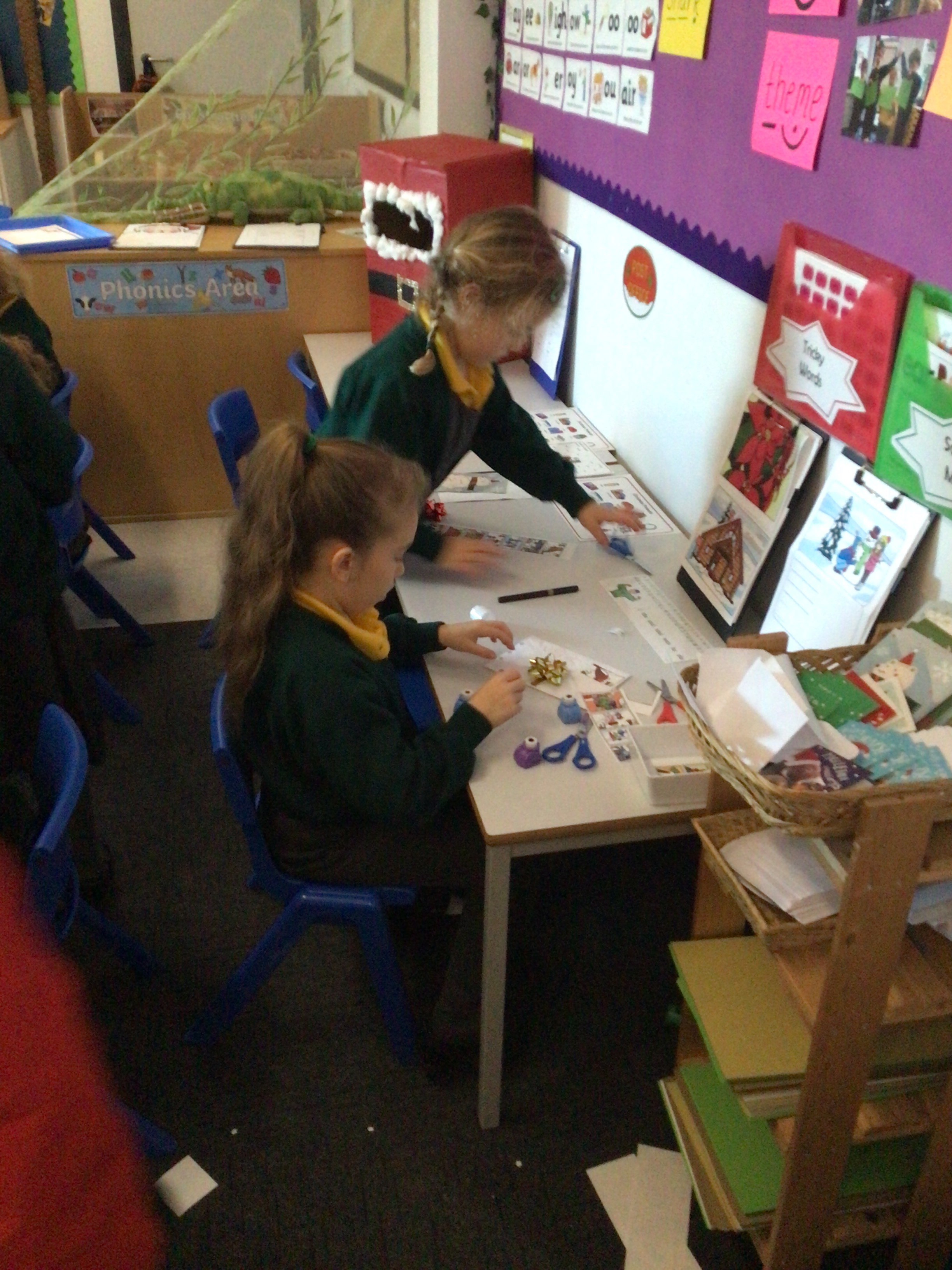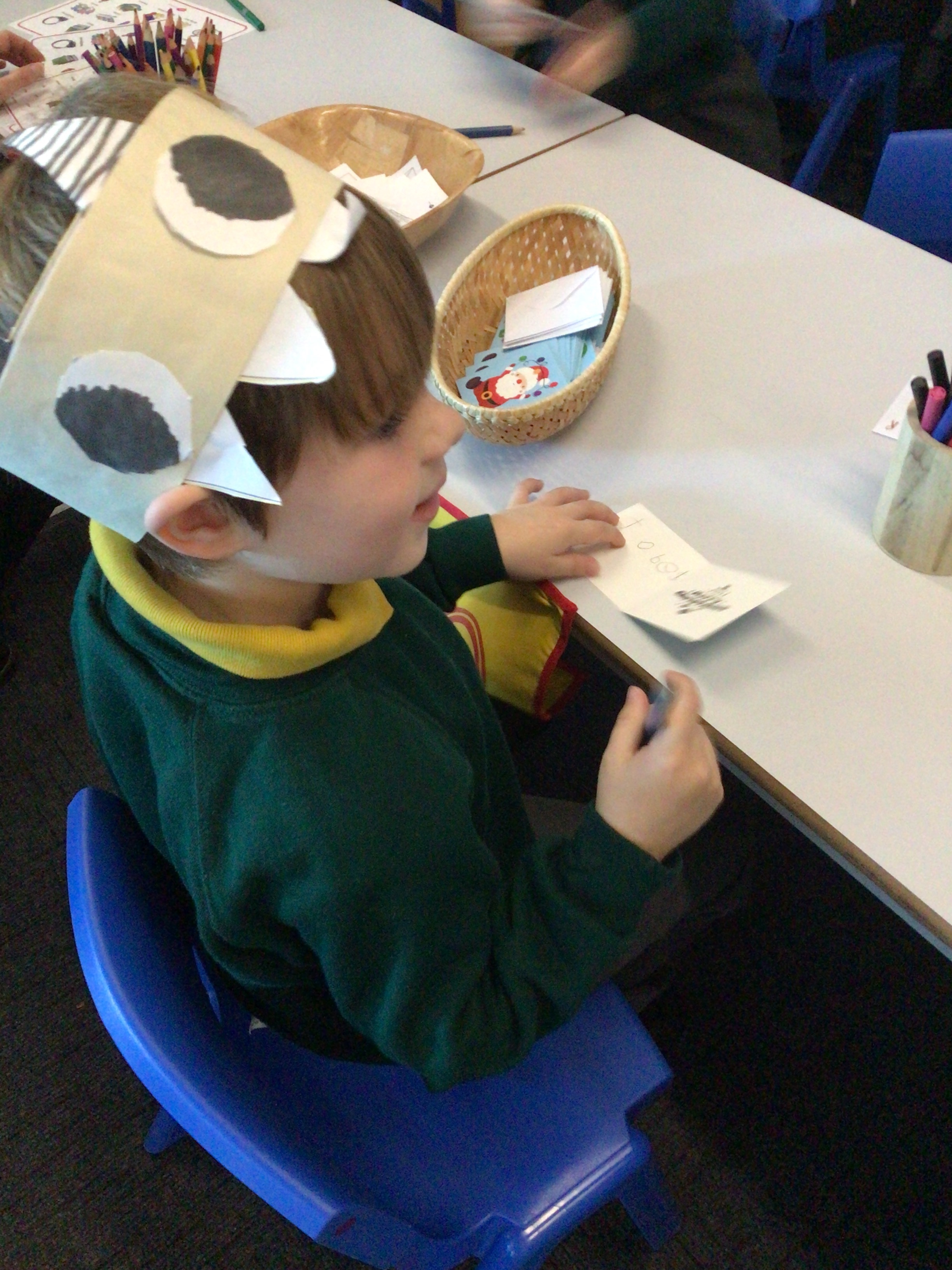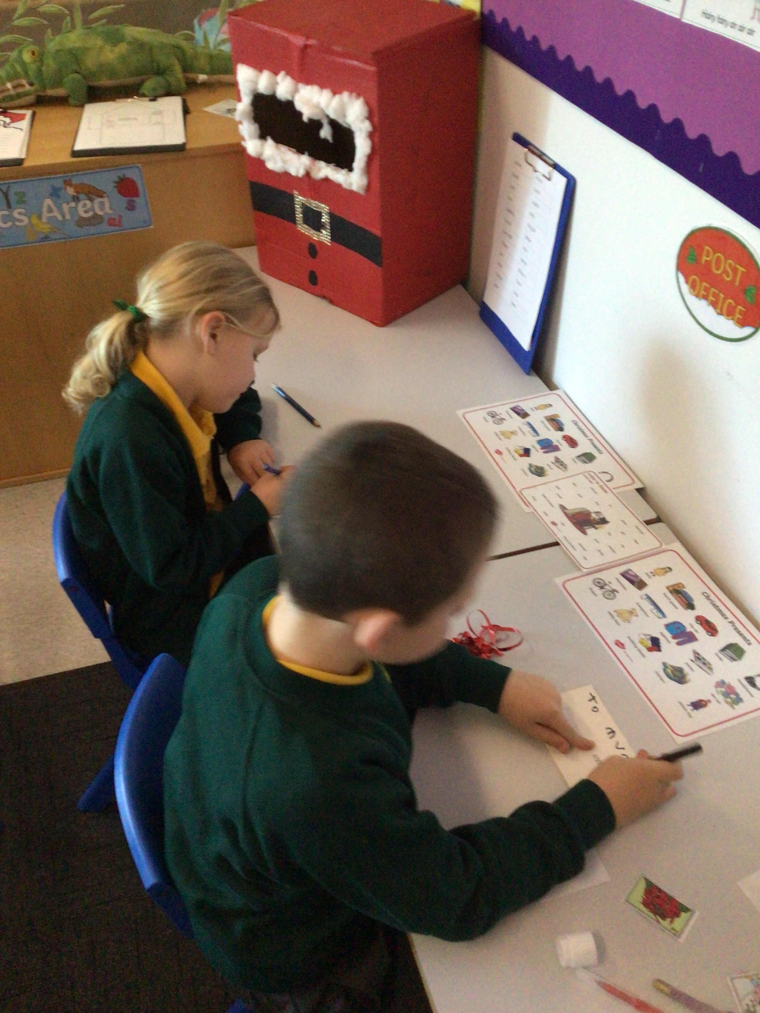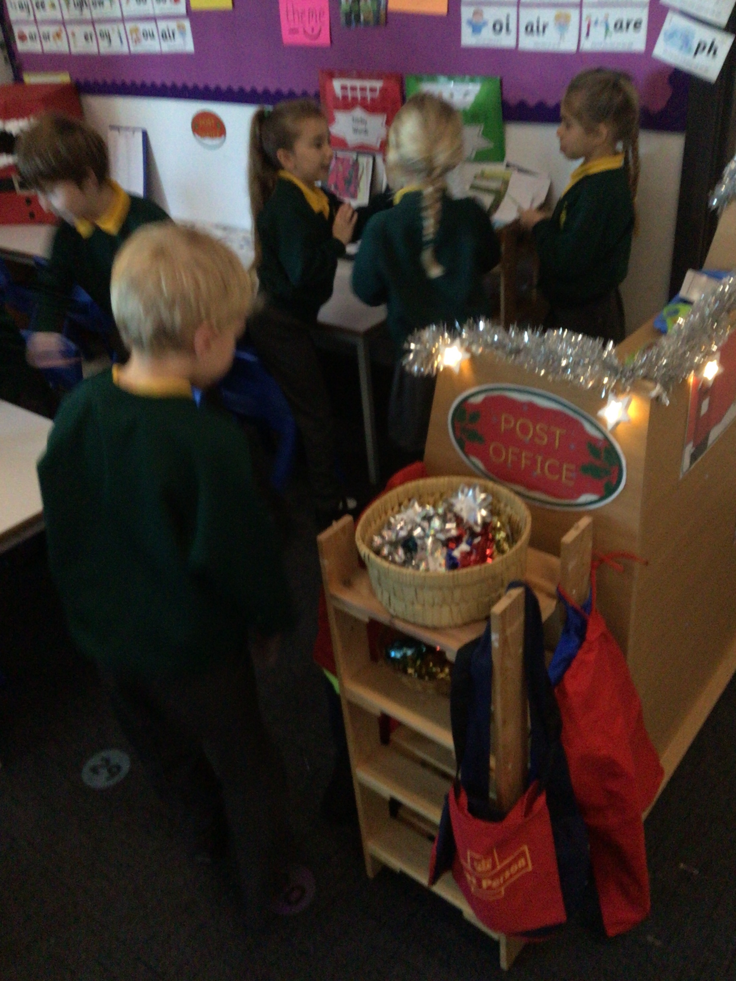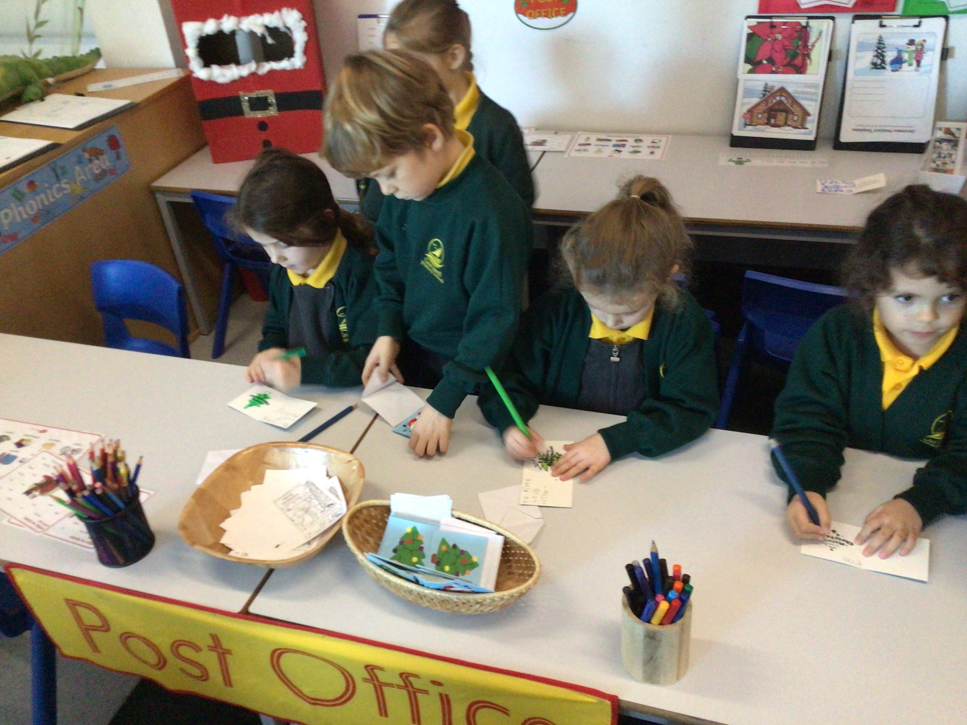 We were very excited this morning to discover that the classroom has been turned into a Winter Wonderland! All the children’s paper chains have been hung, the Christmas tree put up and fairy lights everywhere! The writing area has been turned into a Christmas post office with a Father Christmas post box. It has been such a busy area of the classroom all day! The children have thoroughly enjoyed making cards for each other and for family members and writing letters to Father Christmas!