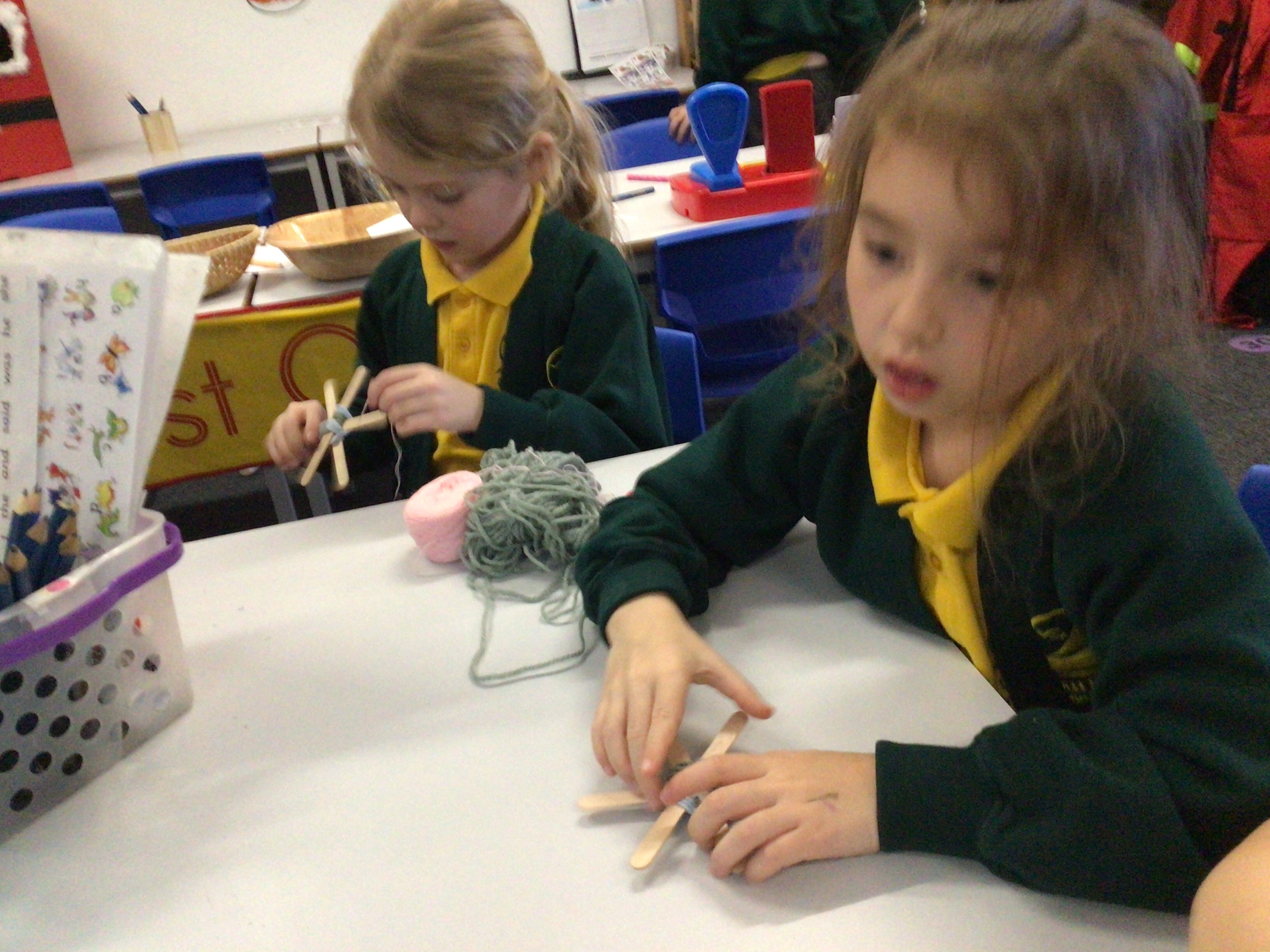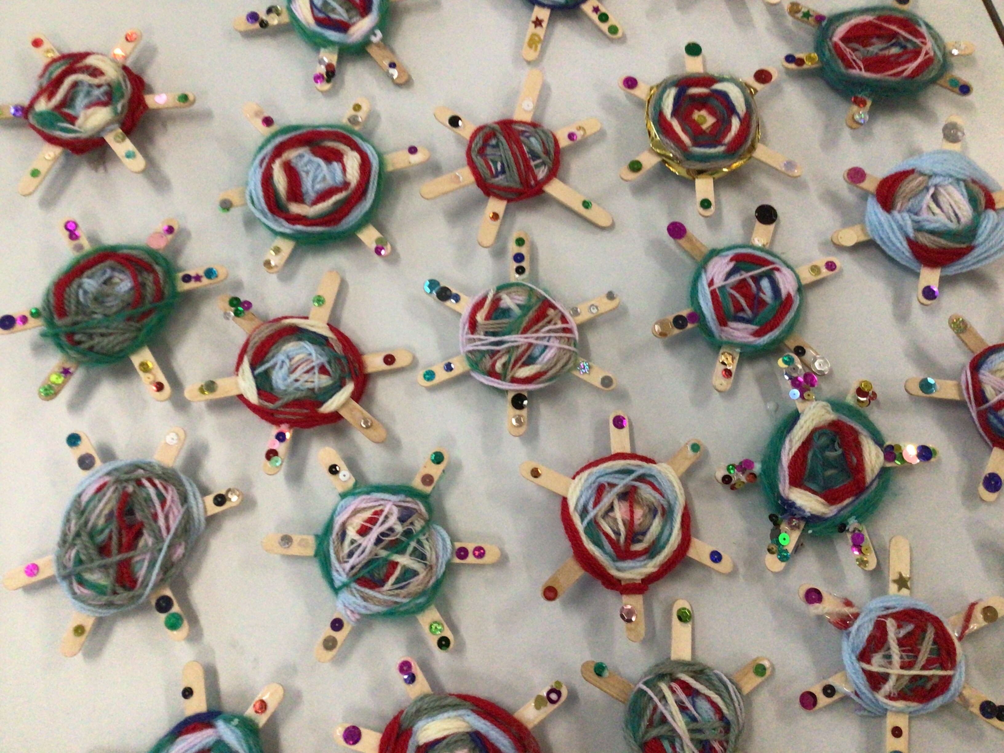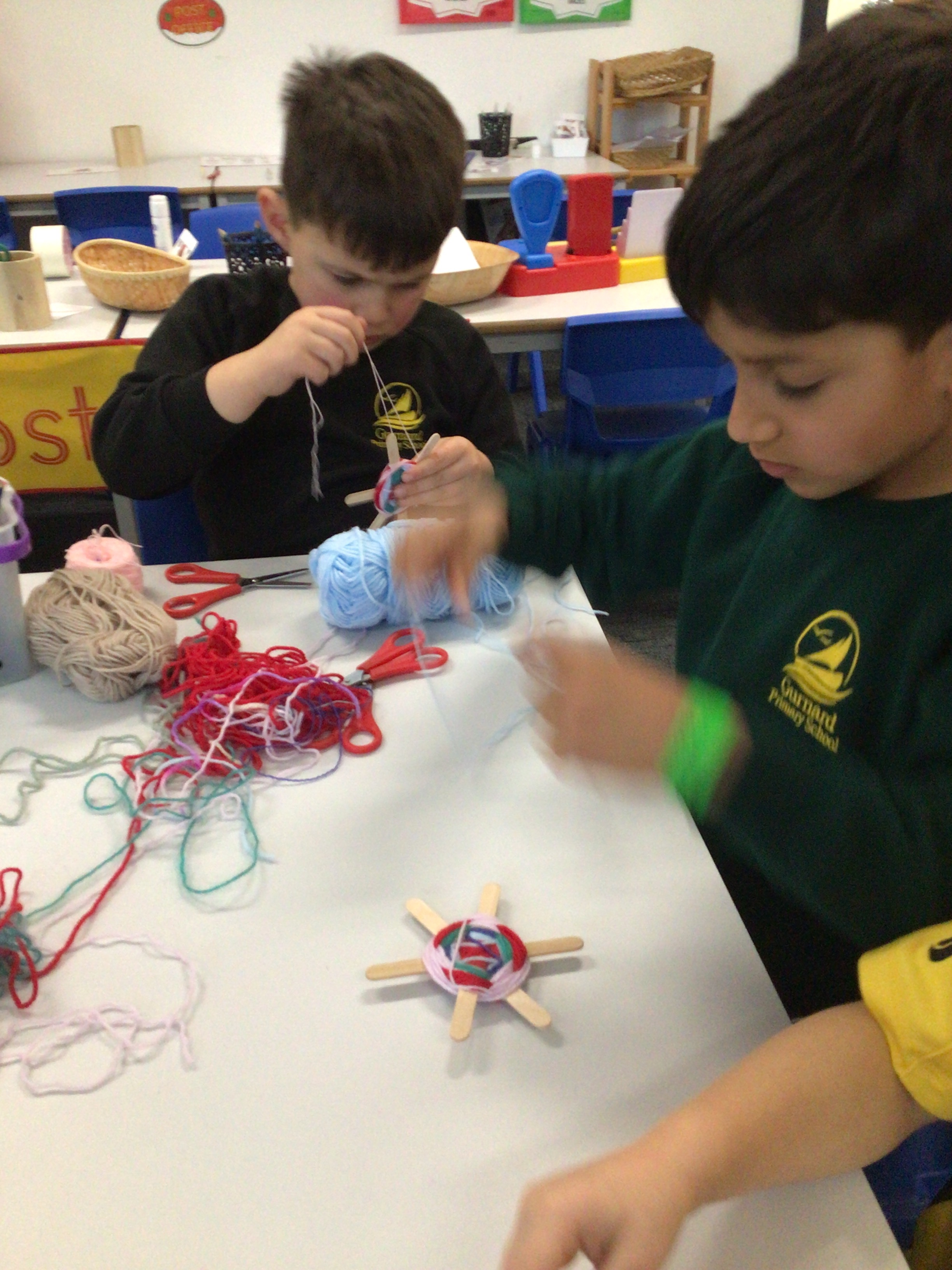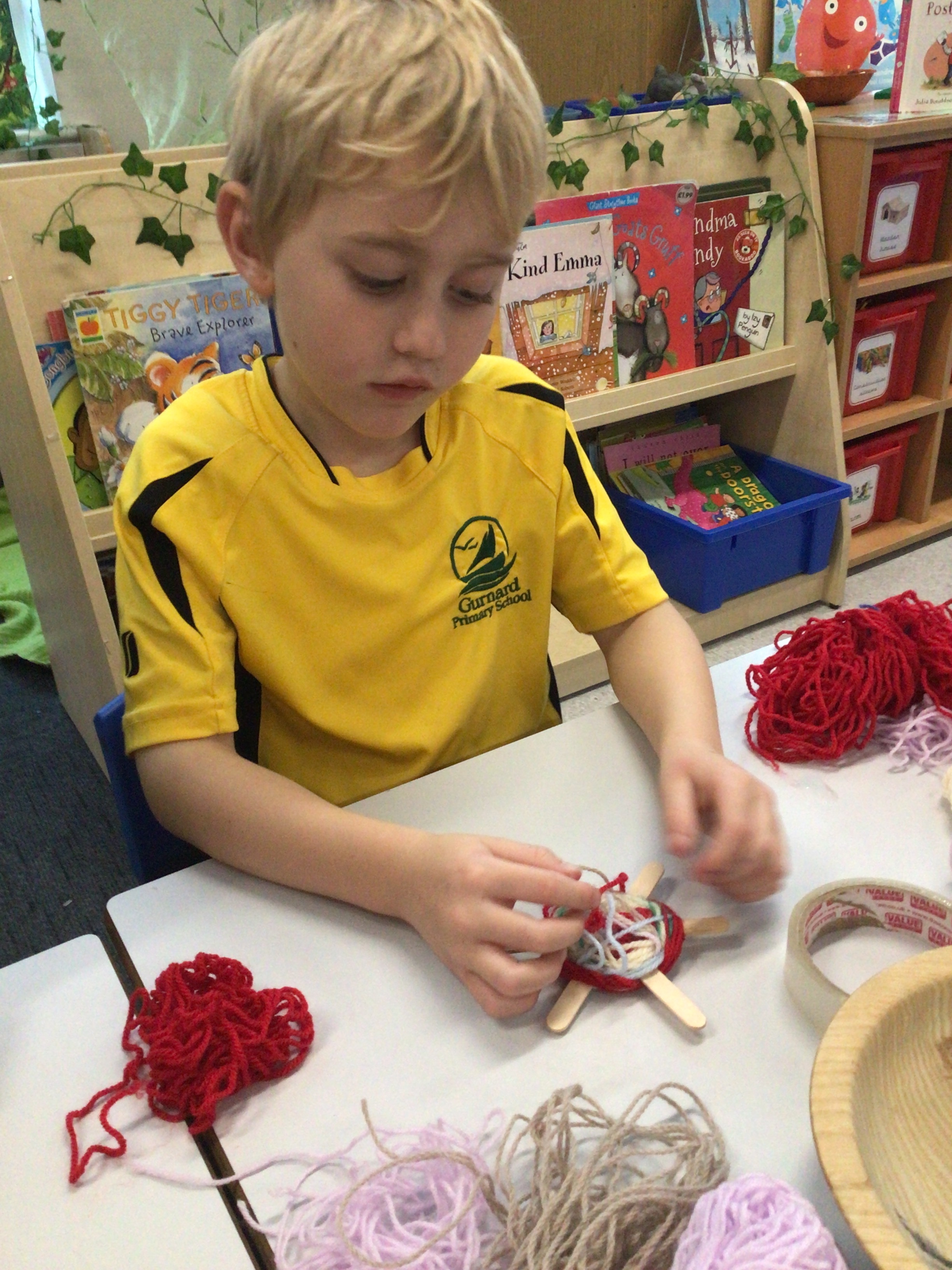 This week we have used our weaving skills that we have learnt over the last term to create a Christmas tree decoration. We used lolly sticks to make a star and then used different coloured threads to weave around the sticks, going over and under as we went round. The children had to cut different lengths of thread and then fasten them at the back either by tying or sticking sellotape.