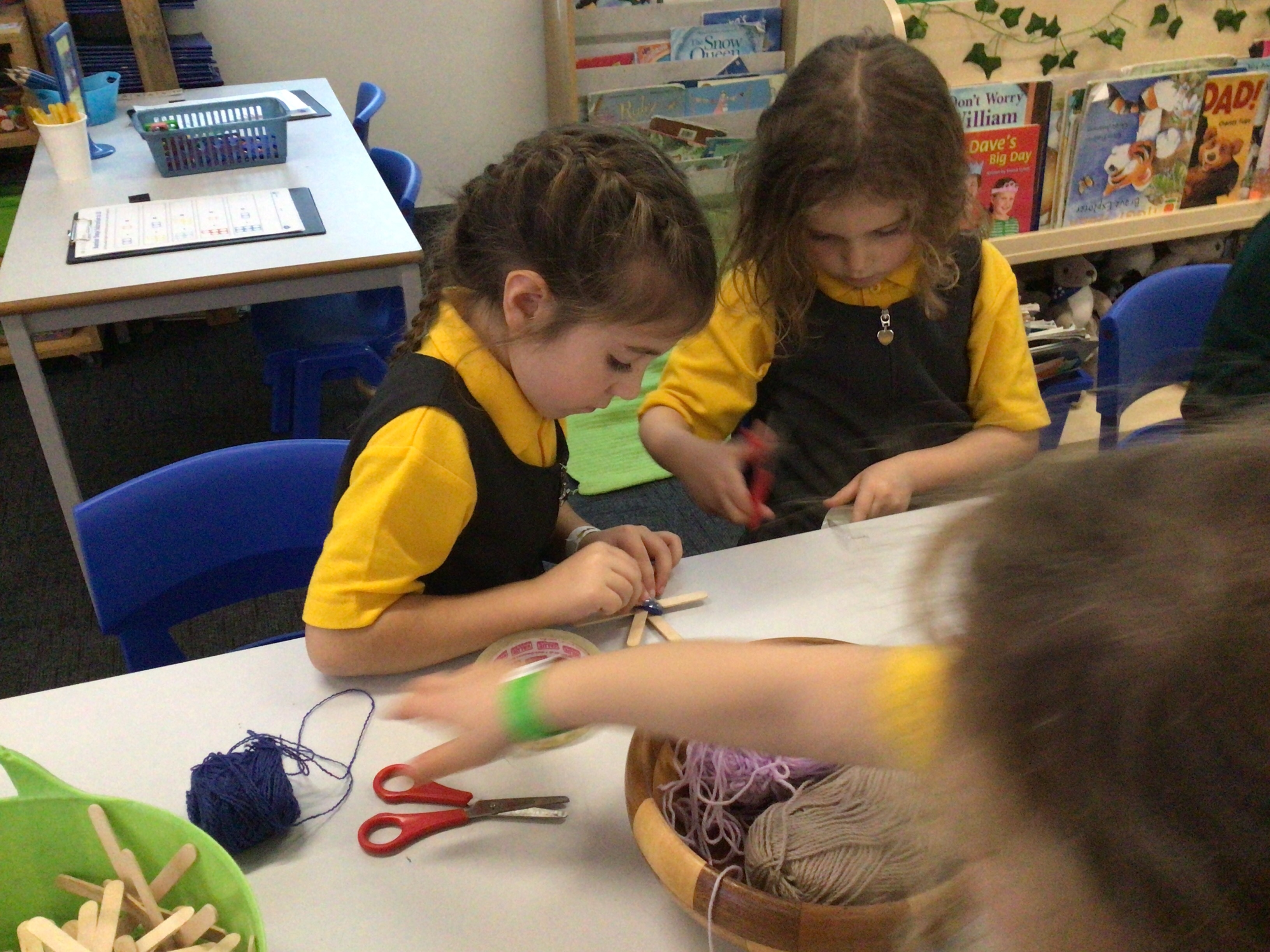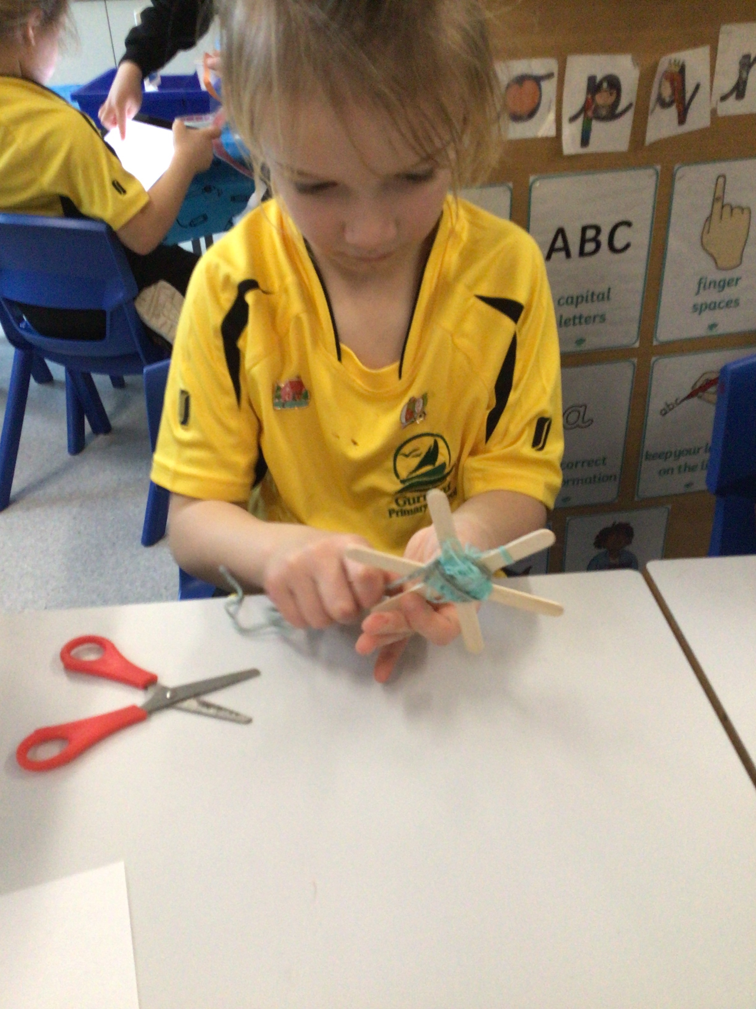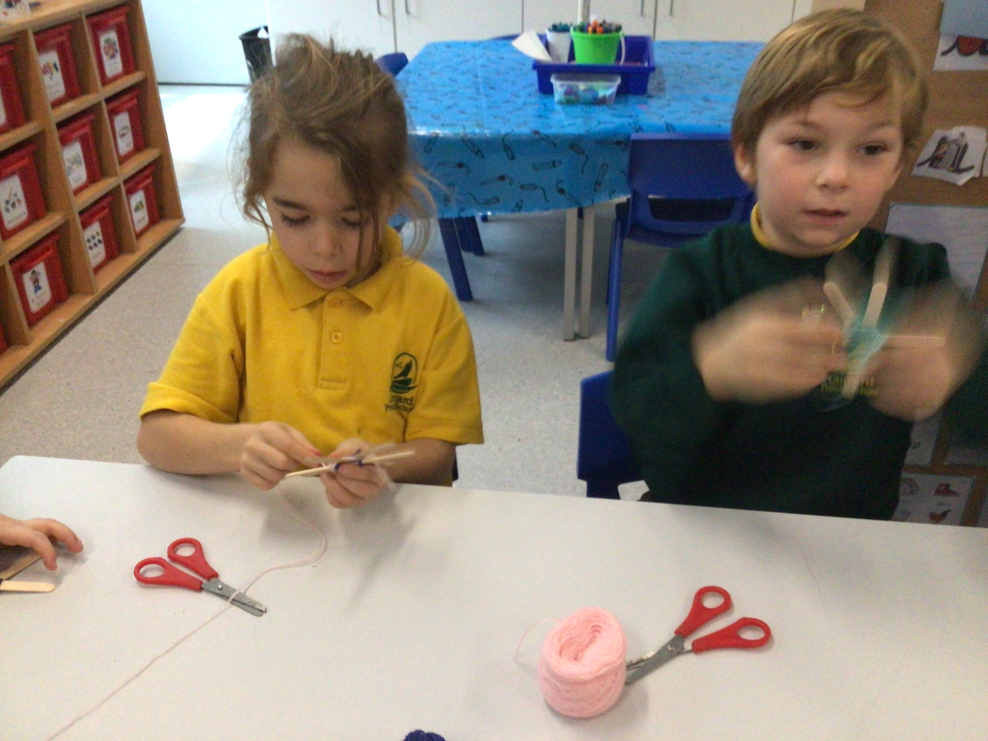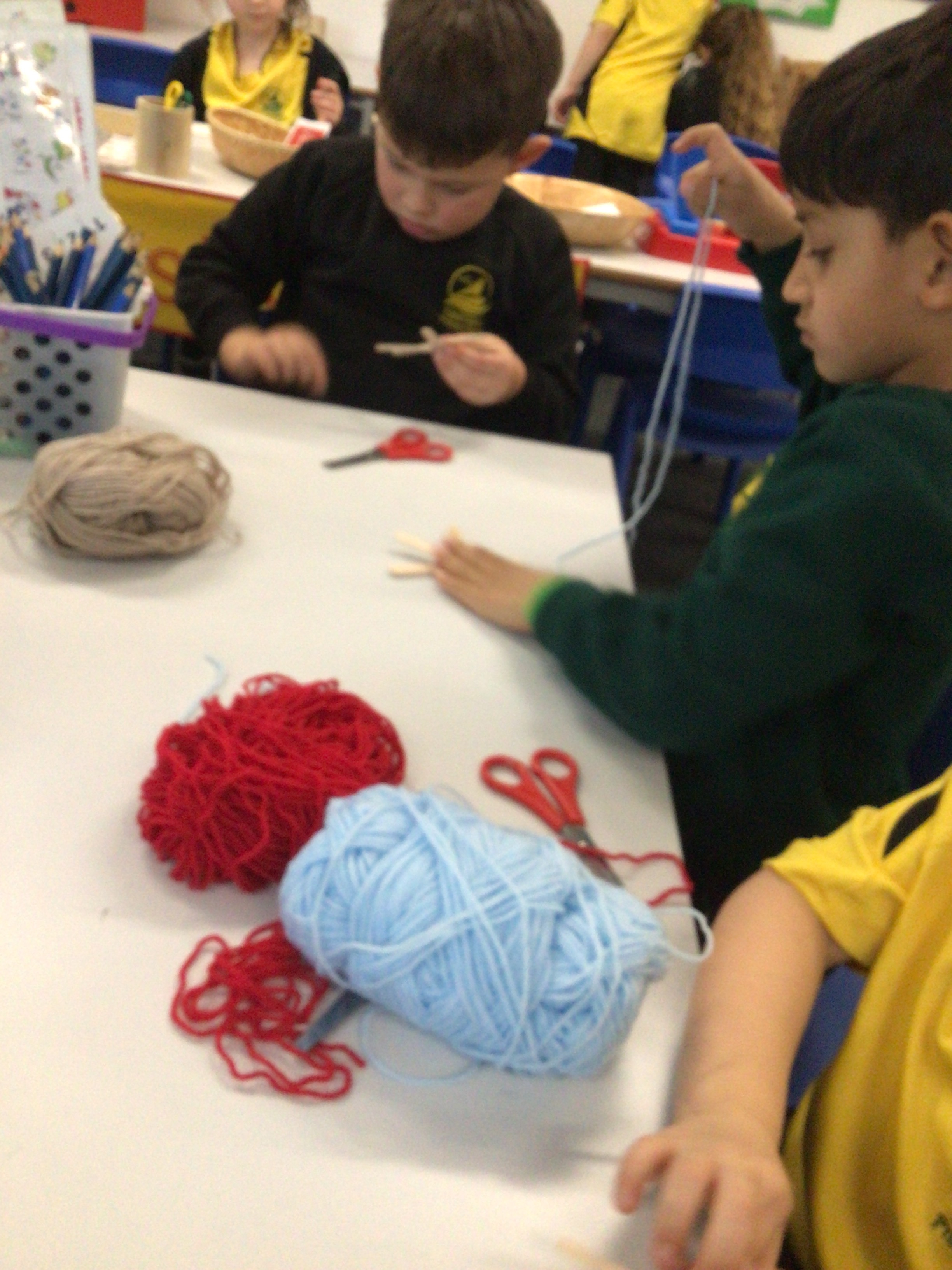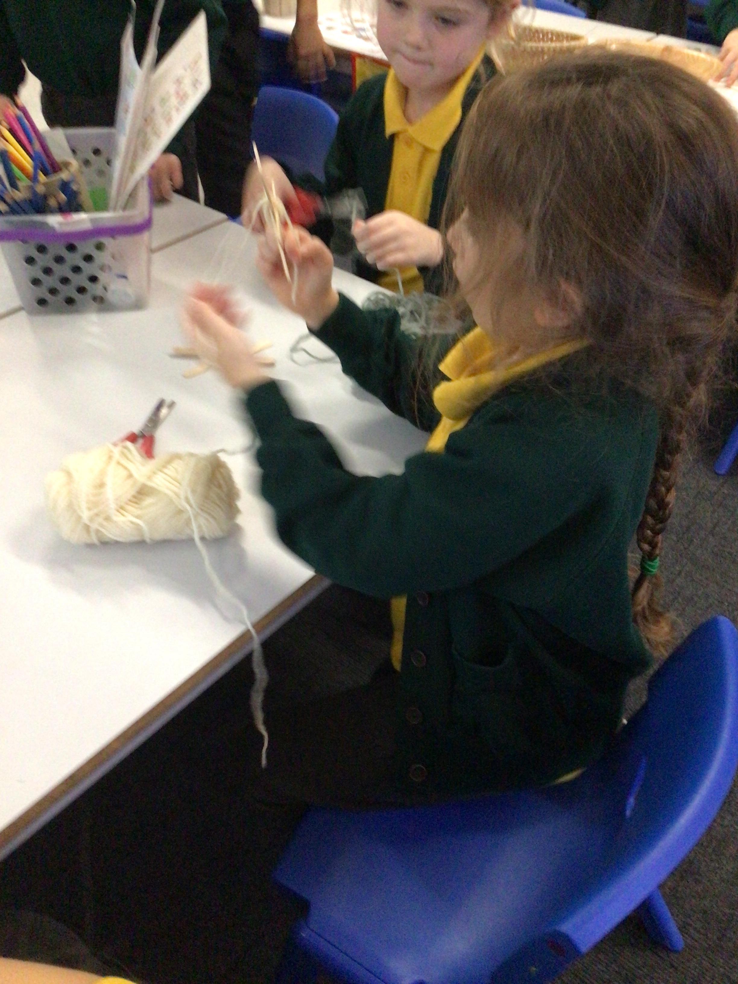 This week we have used our weaving skills that we have learnt over the last term to create a Christmas tree decoration. We used lolly sticks to make a star and then used different coloured threads to weave around the sticks, going over and under as we went round. The children had to cut different lengths of thread and then fasten them at the back either by tying or sticking sellotape.